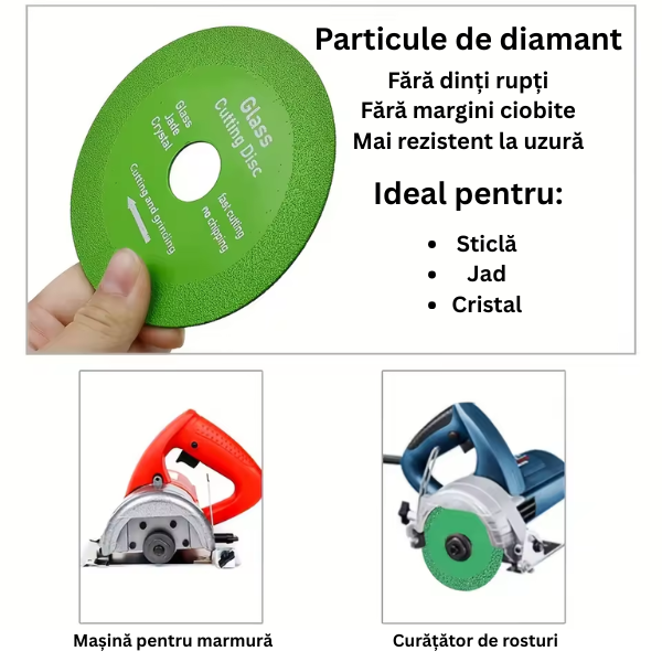 „Folosesc discul pentru tăiere de sticlă și cristal în atelier. Se comportă impecabil, tăieturile sunt fine și nu lasă urme. În plus, generează mai puțin praf decât alte discuri pe care le-am încercat.”