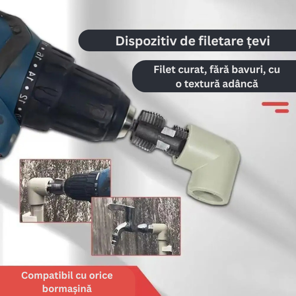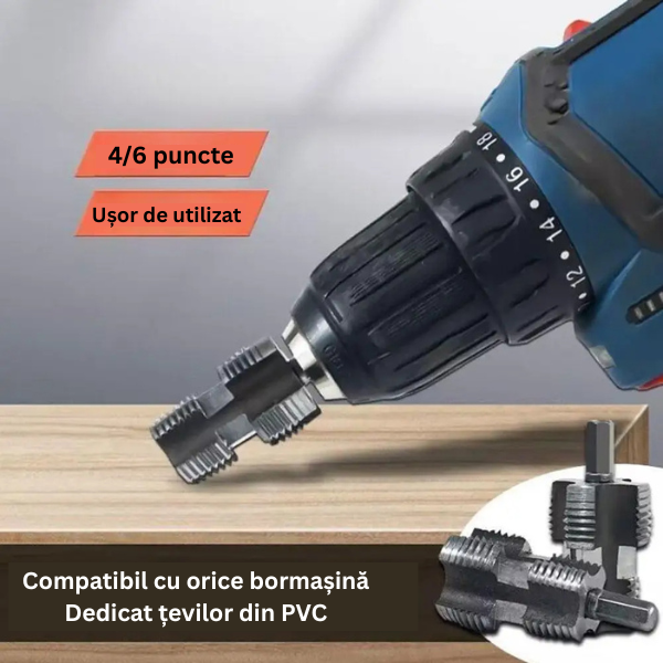 „Un produs excelent! L-am folosit pentru a reface filetul la câteva țevi mai vechi din PVC și a funcționat perfect. Se montează ușor pe bormașină, iar filetul iese curat.”