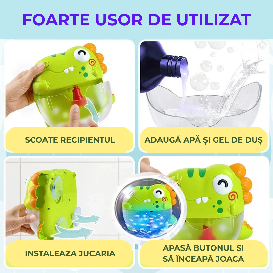 Umple recipientul cu spumă și apă , apasă butonul și bulele încep să curgă automat, oferind distracție instantă.