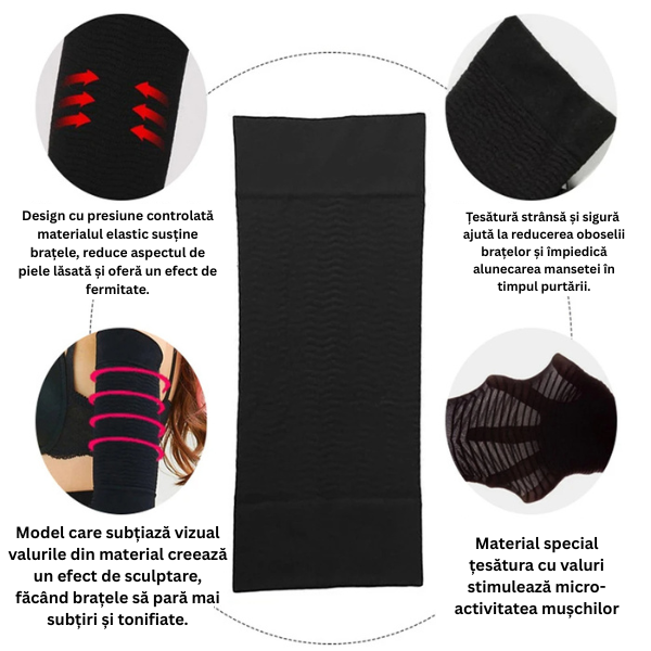 Manșeta de compresie este concepută să ofere sprijin brațelor, să reducă aspectul de piele lăsată și să creeze un efect vizual de subțiere.
