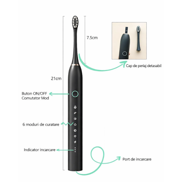 Tehnologia sonică cu 42.000 vibrații pe minut îndepărtează placa bacteriană mult mai eficient decât o periuță clasică.