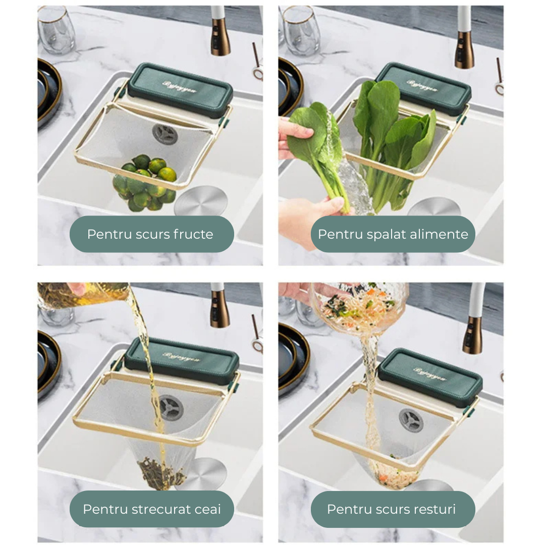 Poate fi folosit atât pentru colectarea resturilor alimentare, cât și ca suport de uscare pentru lavete, bureți sau alte ustensile de curățenie.