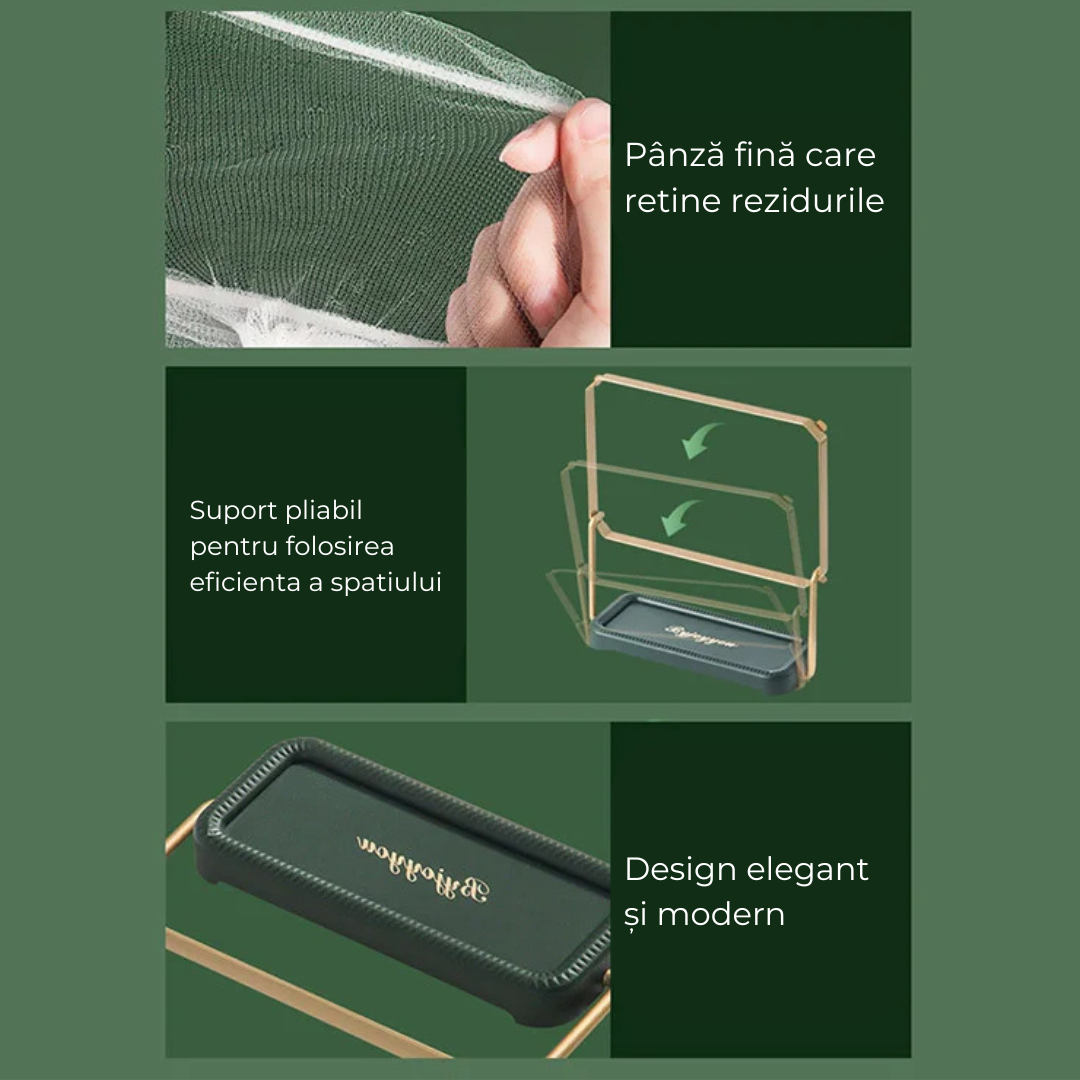 Baza suportului are fante de drenaj care permit uscarea rapidă a lavetei sau buretelui. Materialele rămân curate și aerisite, evitând mirosurile neplăcute.