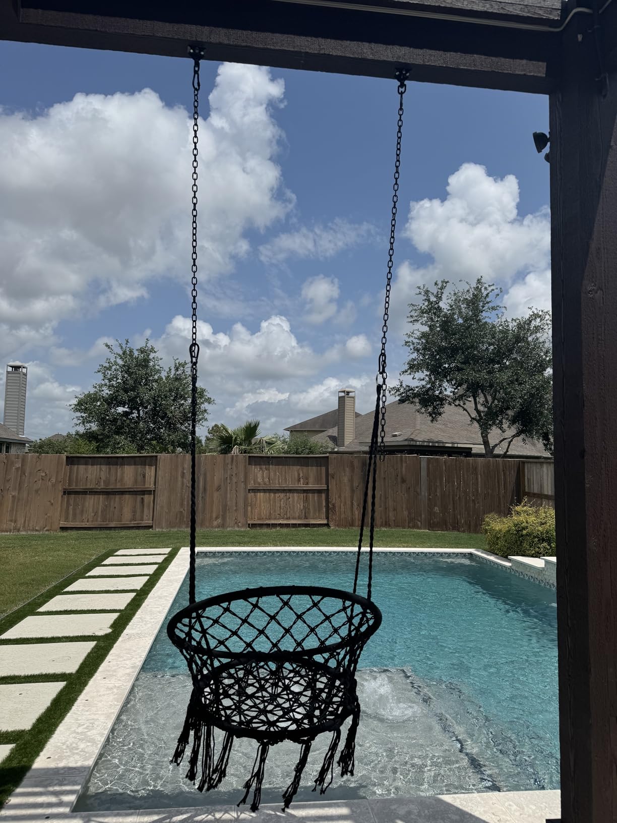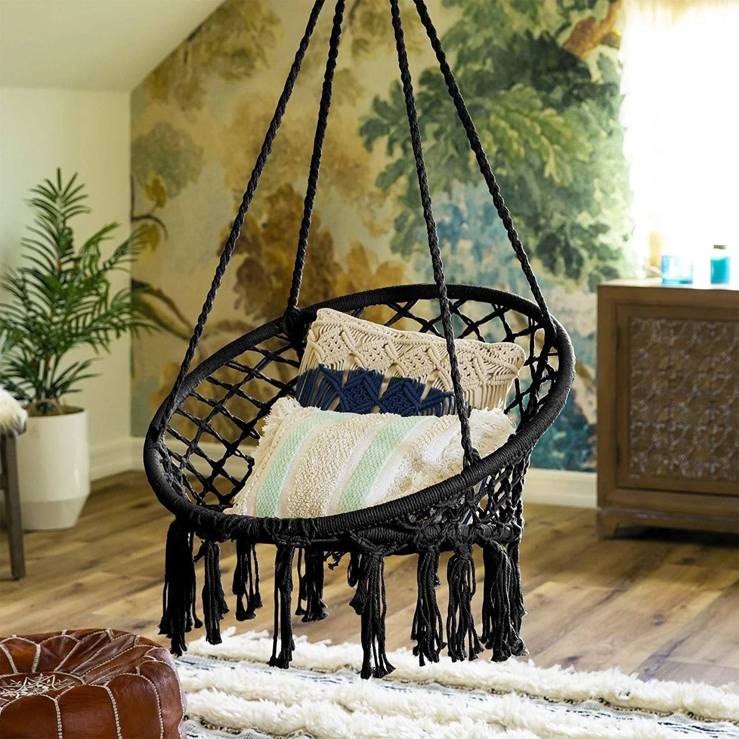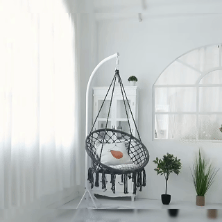 Leagănul are un aspect boho-elegant, cu franjuri decorative și țesătură premium din bumbac. Se potrivește perfect în grădină, pe terasă sau balcon, transformând spațiul într-o zonă de relaxare cu personalitate.