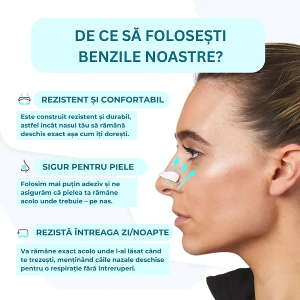 Dilată cavitatea nazală pentru o mai bună ventilație, prevenind probleme precum gura uscată și durerile de gât cauzate de respirația pe gură.