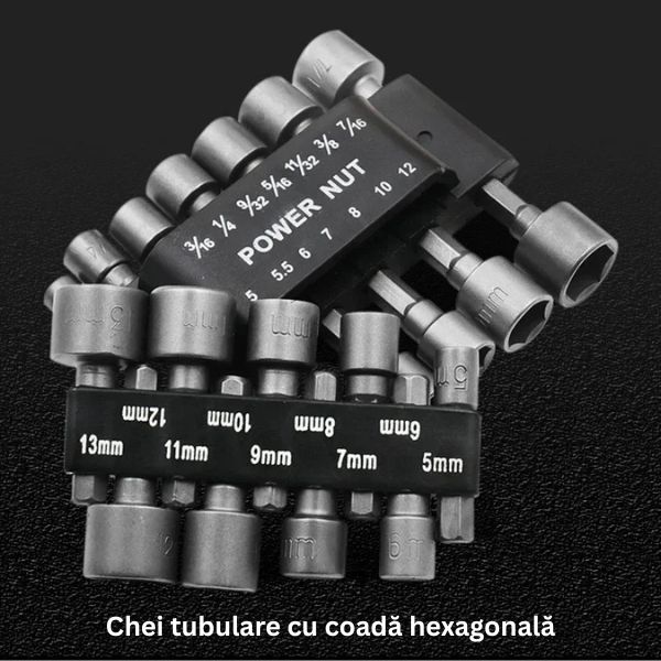 Setul conține 14 capete tubulare hexagonale (5 mm – 13 mm), compatibile cu o gamă largă de șurubelnițe electrice, pneumatice și manuale, dar și cu bormașini sau mașini de găurit cu prindere de 1/4”. Ideal pentru proiecte casnice, auto, tâmplărie sau reparații mecanice.