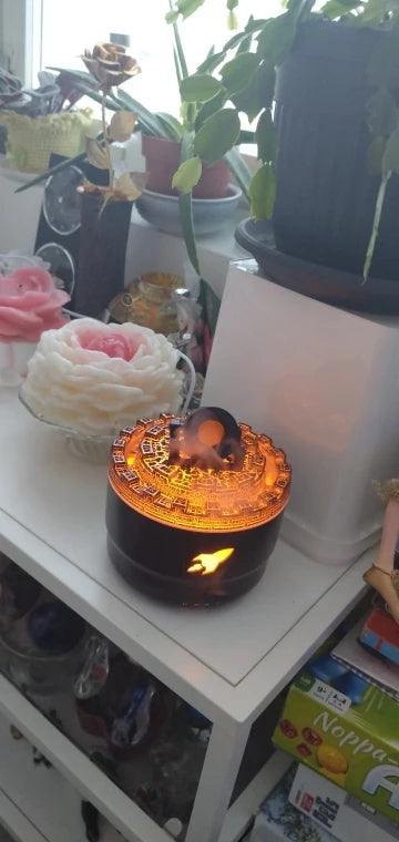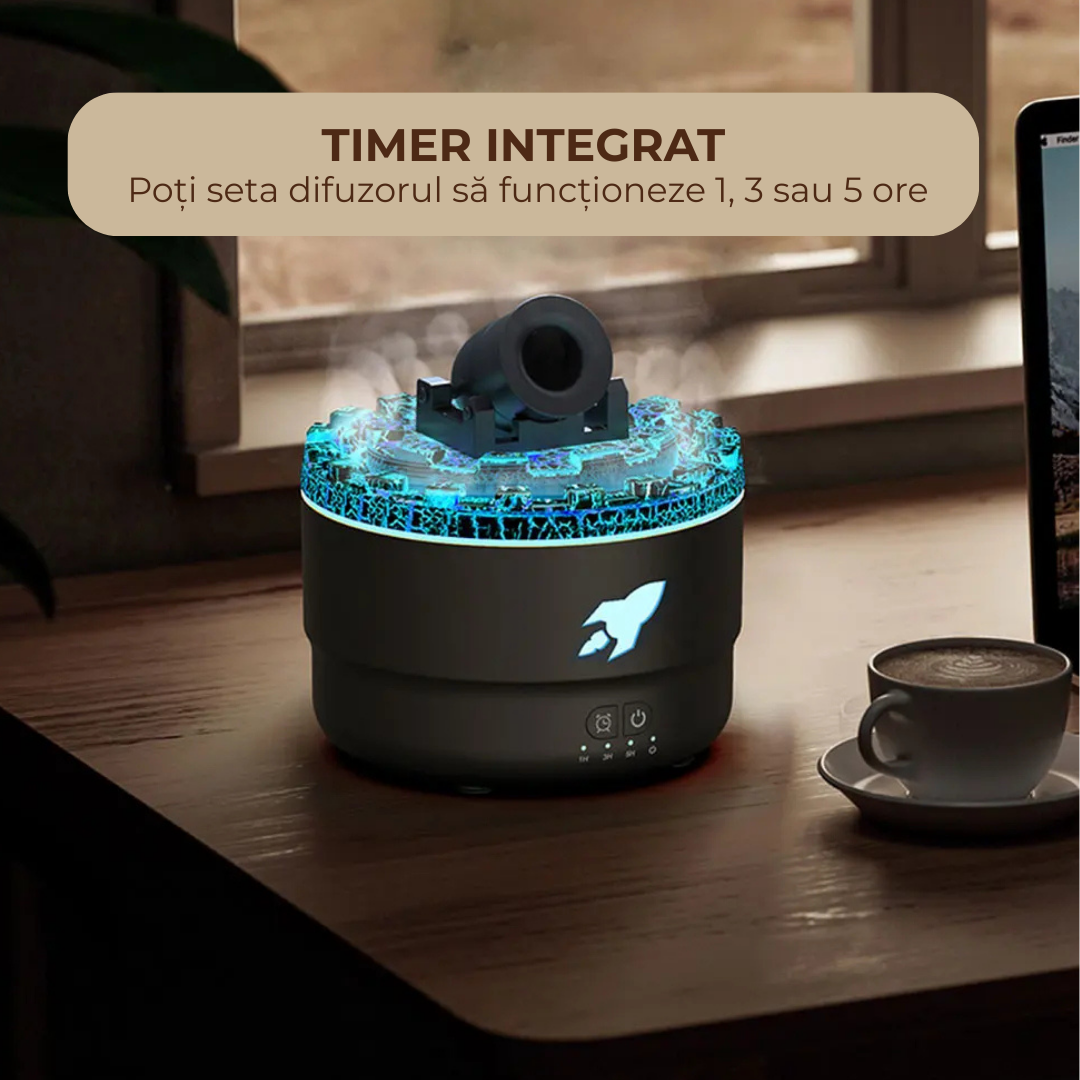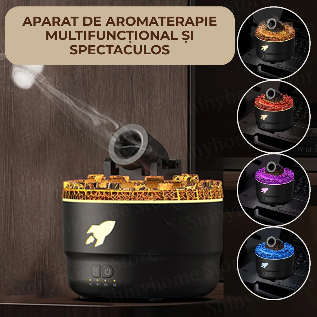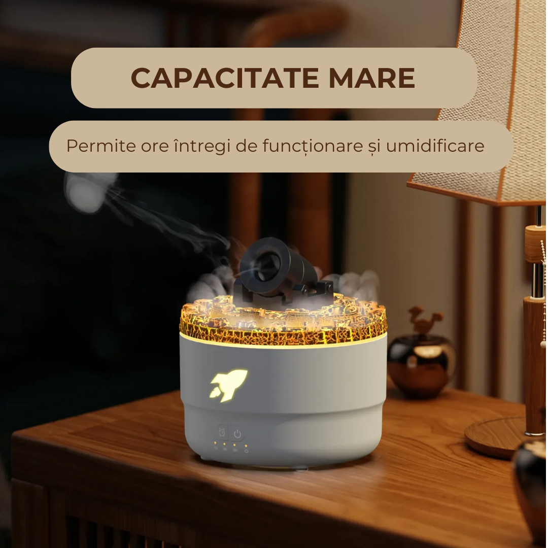 Difuzorul are un aspect spectaculos, cu efect vizual de crăpături de lavă și abur în formă de turn, creând o atmosferă caldă și spectaculoasă în orice încăpere.
